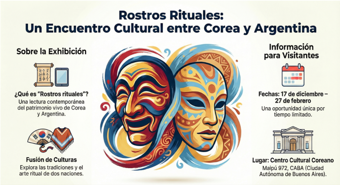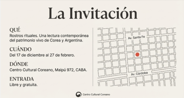 El Centro Cultural Coreano inaugura el próximo miércoles 17 de diciembre a las 19h la exhibición “Rostros rituales: una lectura contemporánea del patrimonio vivo de Corea y Argentina”, una propuesta que explora el valor simbólico y social de las celebraciones populares como puentes culturales entre ambos países.